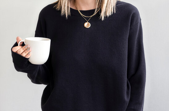 Girl in template blank black sweatshirt home,  coffee design. Black hoodie 18000 model mock up blank, empty, copy space