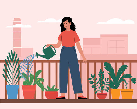 Woman Watering Plants on Balcony Garden with Watering Can - Urban Gardening