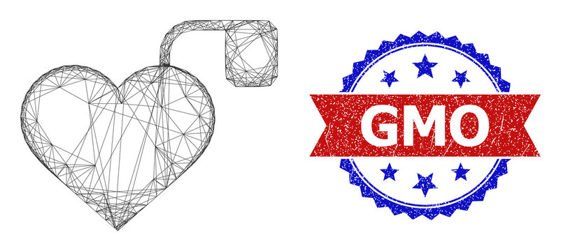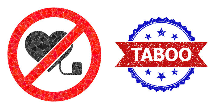 Low-poly forbidden pacemaker polygonal symbol illustration, and grunge bicolor rosette seal, in red and blue colors. Mosaic forbidden pacemaker is composed of random color triangles.