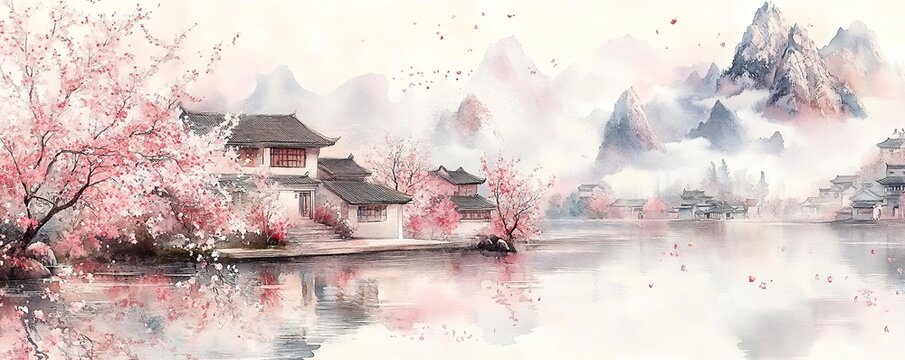 Traditional Chinese water town with white-walled houses, pink blossoms, and misty mountains.