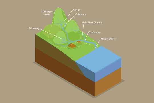 3D Isometric Flat Vector Conceptual Illustration of Drainage Basins, Water Basin System with Mountain River Streams Outline Diagram