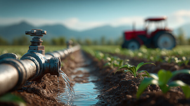 Irrigation pipeline delivering water to young crops in a field, illustrating sustainable agriculture and efficient resource management for food security.