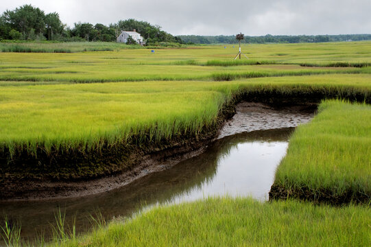 Tranquil Cape Cod coastal scene. View of protected saltwater march and distant osprey bird nest near Grays Beach in Yarmouth Port, Massachusetts.