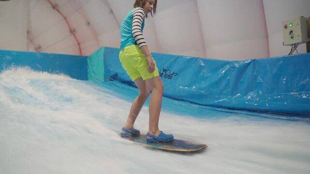 Water sport activity, balance concept. Little athlete enjoying indoor surfing. Teenager rides board on waves on simulator in sports complex. Surfing coach and student in session on wave simulator.