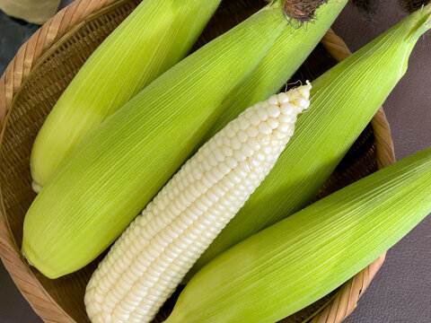 Colorful small ears waxy corns with silk, corn leaf and old wooden background.