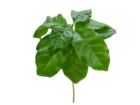 Small bush of coffee tree with luscious green glossy leaves, isolated. Young coffee plant with waxy leaves