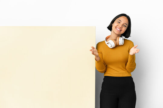 Young woman listening music with a big empty placard over isolated background doing coming gesture
