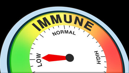 Immune low, text, word level concept illustration with barometer or tachometer meter on black background. Suitable for weak immunity, low defense, and vulnerable health visuals