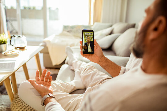 Man having video call with financial advisor from home