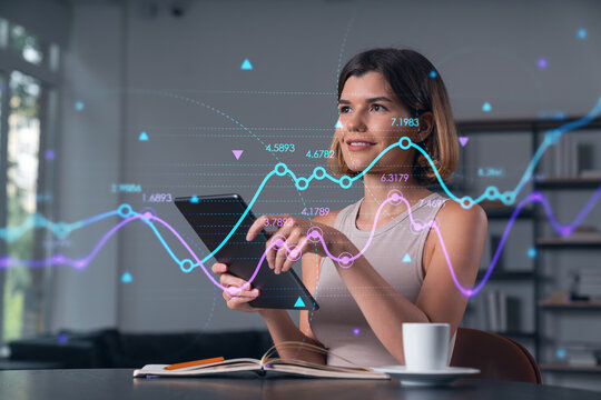Smiling businesswoman in casual wear holding tablet device touching it at office workplace. Concept of distant work, business education, information technology. Forex graph and chart hologram