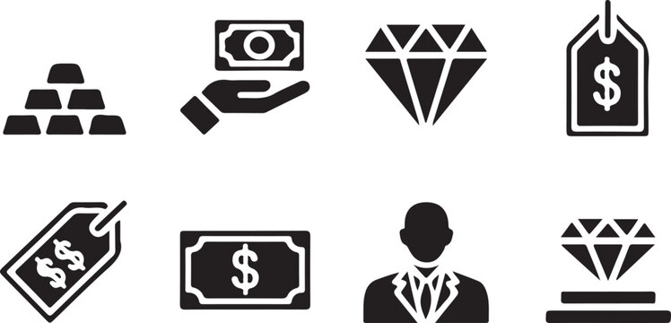 Money icon grid, cartoon currency, dollar coins, financial symbols, banking illustration, savings graphics, economy icons, wealth design, finance assets, cash visuals