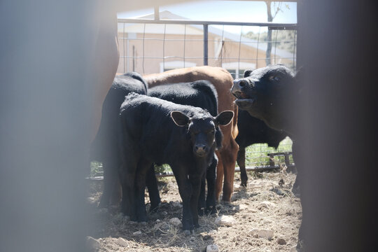 Calves during weaning on New Mexico ranch, beef in agriculture concept on cow farm.