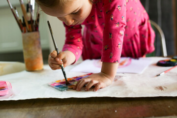 girl wearing pink dress holding a paintbrush and dipping it in water colour paint