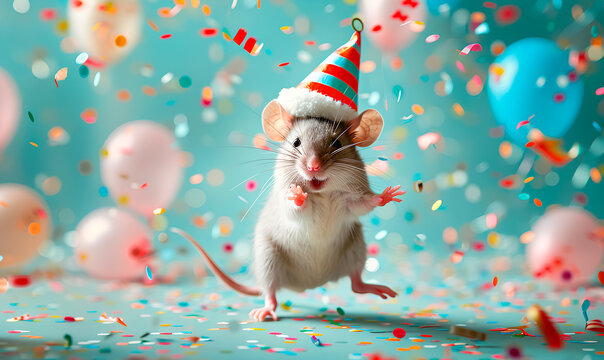 A white mouse wearing a party hat jumps in the air with confetti and balloons falling around it
