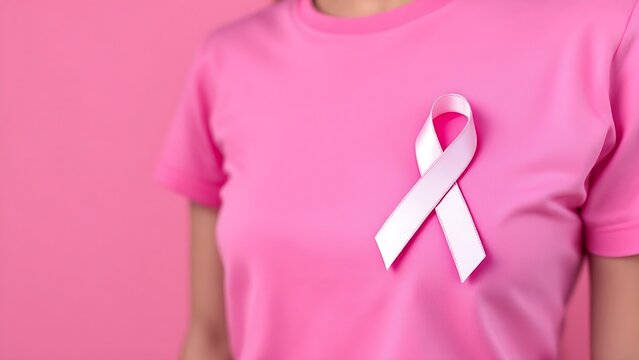 a person wearing a pink shirt with a pink ribbon pinned to it, symbolizing breast cancer awareness
