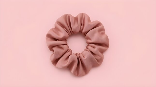 The image shows a fabric hair scrunchie isolated on a soft pink background. It has a soft, gathered circular shape with visible folds that give it volume and texture. The material is silk fabric.