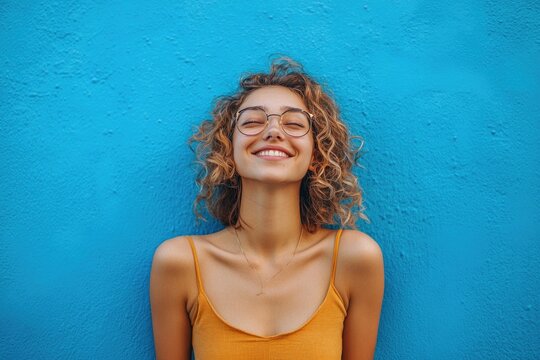 A woman wearing glasses stands in front of a blue wall, possibly waiting for something or observing her surroundings