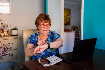 Close up of hand touching smartwatch with health app on the screen, gadget for fitness active lifestyle.
