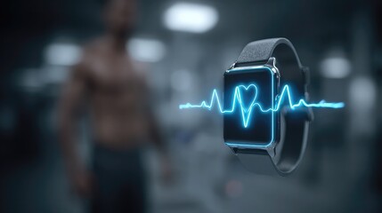 Concept of The technology to check health with smart watch. Futuristic smart watch technology male looking at watch checking health. holographic icon user interface.