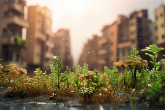 Acid rain damaging plants and buildings, Climate change and environmental degradation, climate change, pollution, bokeh Generative AI