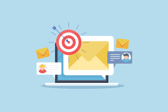 Targeting online audience with email marketing campaign, successful email ads, business presentation, sending email message communication technology, flat design web banner template.