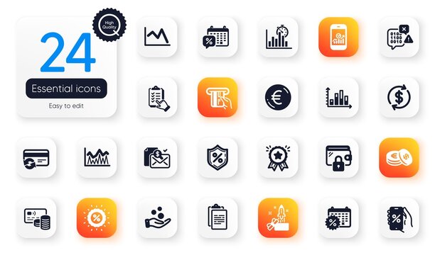 Set of Finance flat icons. Delivery discount, Graph chart and Buy currency elements for web application. Euro rate, Wallet, Loan percent icons. Business growth, Clipboard. Vector
