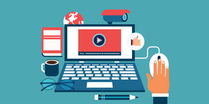 Web based seminar. Distance Learning. E-learning Training business concept. Video tutorials. Online courses. Workplace and working on laptop.