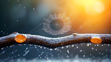 Macro photo of a dew laden spider web stretched between branches sparkling with countless droplets like gems