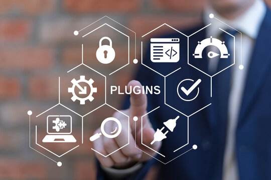 Website plugins concept. Ecommerce CMS with extensions. SEO web developer extension and plugins. Business man working on virtual touch screen presses word: PLUGINS.