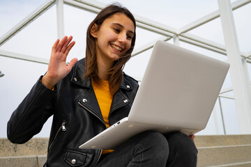 Smiling young woman blogger influencer doing videochat