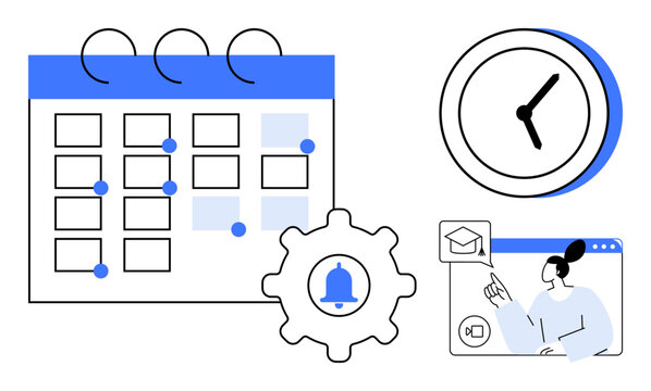 Calendar with marked dates, clock, notification gear with bell, and person attending an online class. Ideal for time management, education, organization, reminders, productivity scheduling