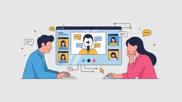 podcast recording setup with desktop computer screen and microphone flat vector illustration for online streaming and digital content