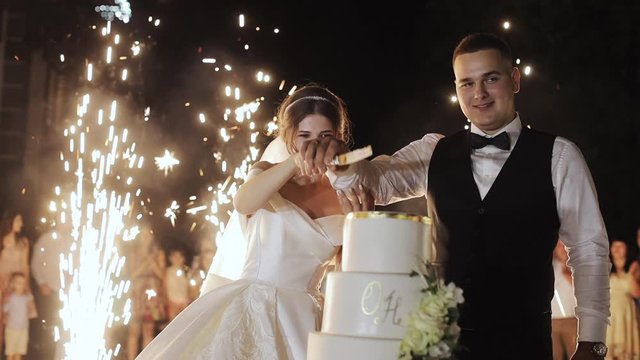 Bride and groom cut the cake and feed each other and laugh on their wedding day