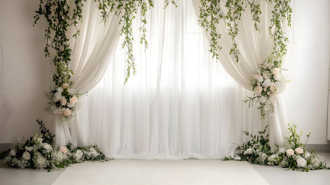 Backdrop with two large white curtains and green vines and flowers on the sides of each curtain. This setting creates a soft and romantic atmosphere for wedding photography.