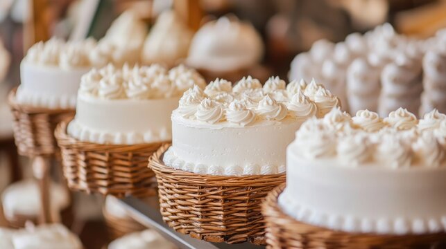White icing wedding cakes displayed in a woven basket