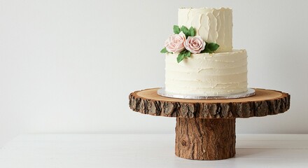 Elegant white cake decorated with pale pink roses, displayed on a rustic wood stand.