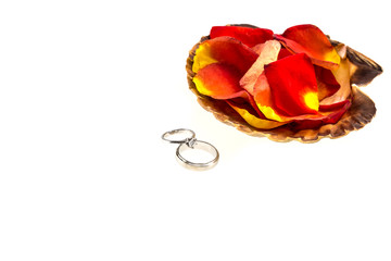 Wedding invitation with a bouquet of delicate roses and rings and hearts