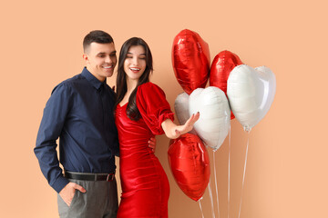 Young engaged couple with wedding ring and heart-shaped balloons on beige background. Valentine's Day celebration