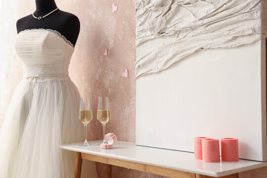 Mannequin with wedding dress, glasses of wine and engagement ring on table near beige wall. Valentine's Day celebration