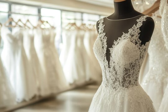 Elegant wedding dresses display in boutique