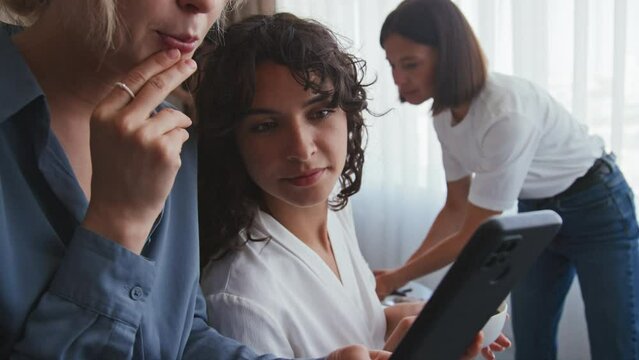 Professional wedding planner talking to young bride about ceremony schedule while doing preparations in morning
