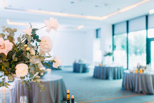 Stylish wedding decor and decoration of the hall. The bride's bouquet and dress, European part. the minimalism and simplicity of the decor