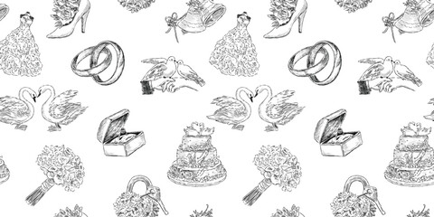 Seamless pattern of wedding symbols different sketches, rings, white swans couple, doves, dress, cake, bouquet, bells, vector background, hand drawn illustration, paper, wallpaper