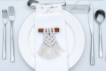Name card on a plate and a gift to guests of Macrame on a stick of cinnamon. Decorative item for a wedding dinner.
