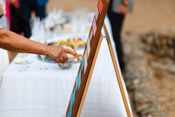 The elderly woman's hand points to the chalkboard Seating chart. Wedding seating chart on the easel at light restaurant on fresh air.