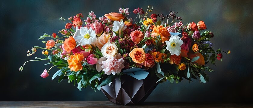 Chic bouquet of seasonal flowers wrapped in modern geometric paper, combining style and sophistication for a trendy floral arrangement
