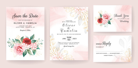 Luxury wedding invitation card template set with gold watercolor floral decorations and glitter. Flowers arrangements for save the date, greeting, details, cover. Botanic illustration vector
