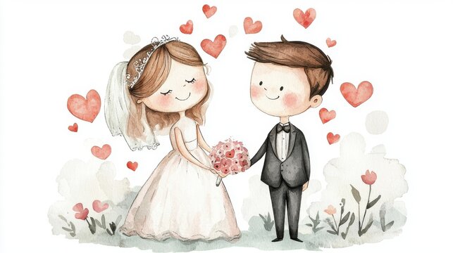 A charming illustration of a happy couple in love, surrounded by hearts, perfect for wedding and romance themes.