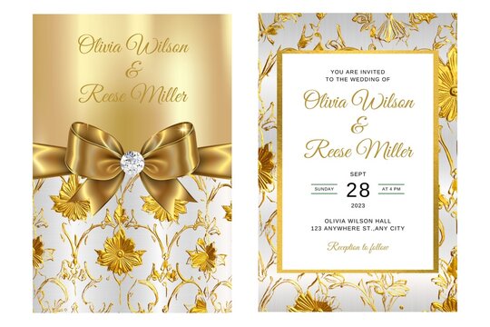 Elegant gold floral wedding invitation with satin bow, diamond detail, and ornate golden pattern on a white background. Perfect for weddings, anniversaries, bridal showers, and luxury events.