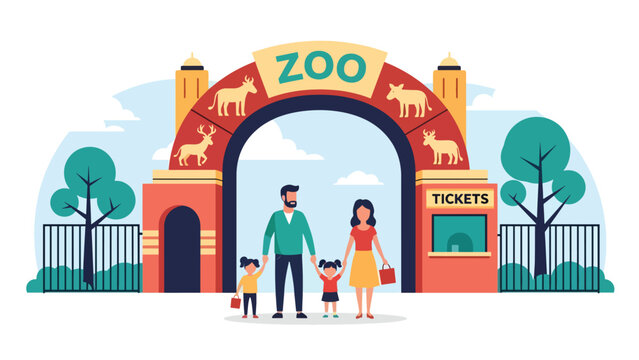 Happy family entering the zoo through the main entrance gate during a holiday trip. Ideal for family travel, tourism, outdoor adventure, and leisure illustrations
